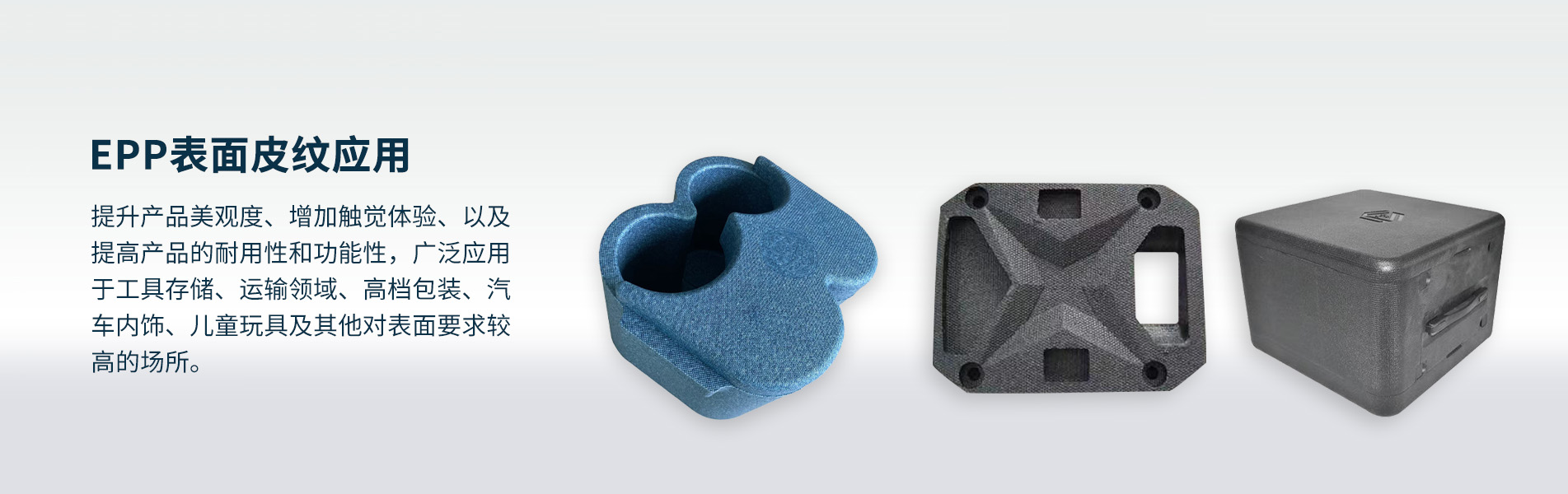 EPP表麵皮紋技術可以賦予EPP製品(pǐn)更加細膩(nì)和高檔的外觀質感。通過在EPP表麵(miàn)形成紋理或圖案,可以使其(qí)看起來(lái)更加精致,並(bìng)增加產品的吸引力和(hé)附加值。